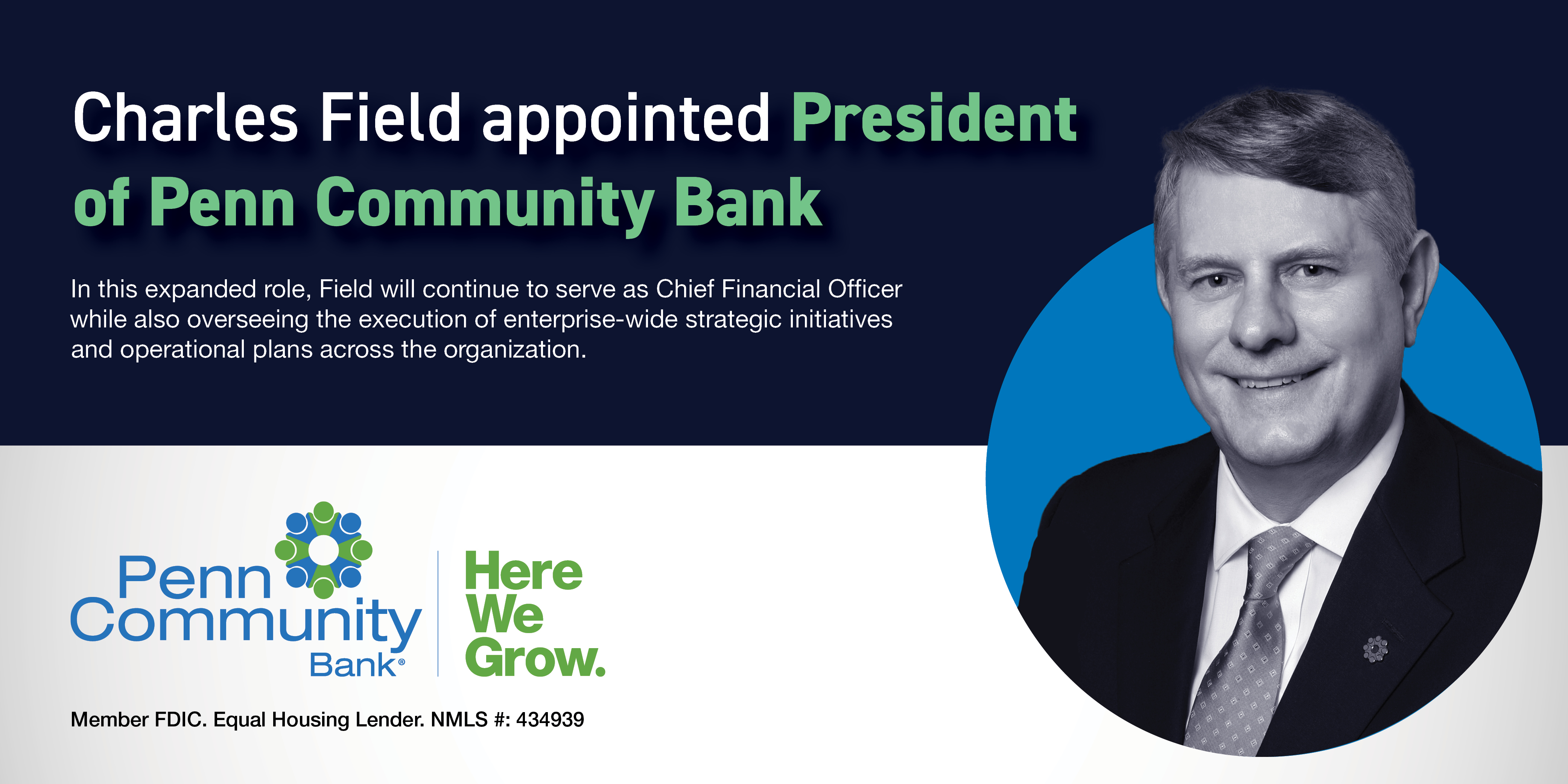 Effective March 27, 2026, Charles Field will be named President and Chief Financial Officer of Penn Community Bank. In this expanded role, Field will continue to serve as Chief Financial Officer while also overseeing the execution of enterprise-wide strategic initiatives and operational plans across the organization.
